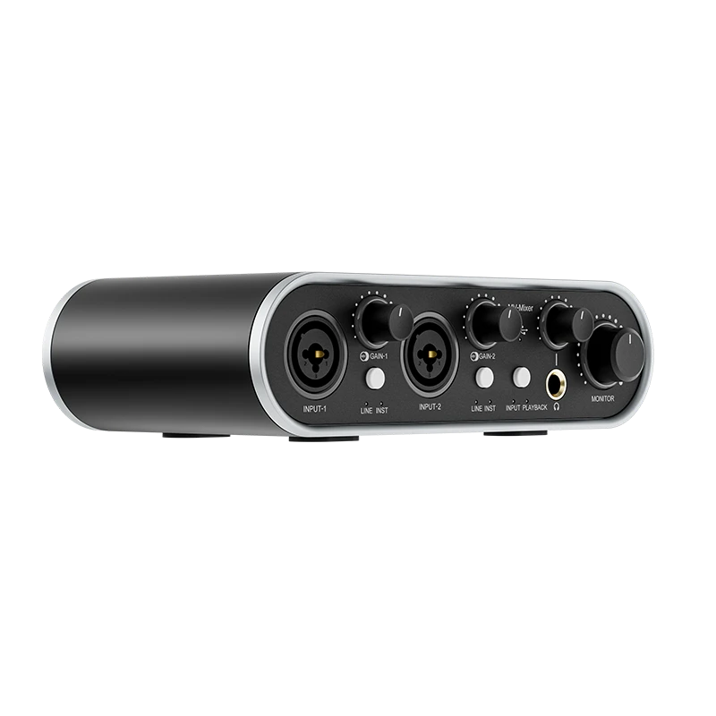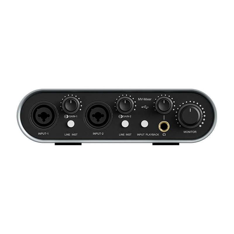 The MV-Mixer is a dual-channel audio interface providing a simple recording and mixing solution for musicians, podcasters, producers, and more. It features two XLR-1/4’’ TRS combo jacks for mic, line, and instrument inputs, independent gain and volume controls, a studio-grade 1/4’’ TRS headphone output for rich sound reproduction, and supports up to 192 kHz 24-bit recording for crystal-clear audio. This compact interface gives you everything you need to create professional-quality recordings across a range of audio applications.