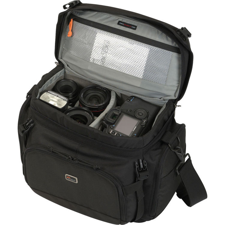 The Lowepro Magnum 200 AW Shoulder Bag (Black) is designed to carry Pro digital SLR camera with a 70-200mm f/2.8 lens attached, 3-4 additional lenses and accessories. It is constructed from water-resistant fabric with 1-piece foam framed padding and a Velex polyurethane and 210 denier nylon lined interior. There is an exterior molded base that offers sturdy and stable protection, water-resistance and stackability. The internal dividing system provides a flexible structure to accommodate lots of gear in various configurations.