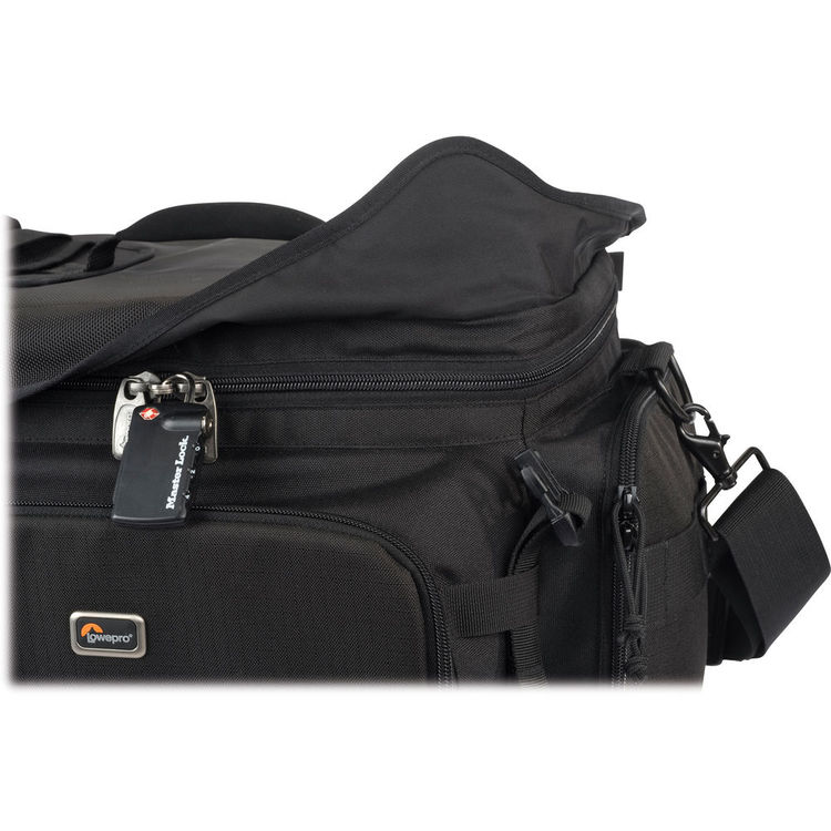 The Magnum 200 AW has a quick-access organization pocket, 2 side pockets, a removable accessory pocket, laminated mesh organization pocket inside the lid and a mesh ID pocket on the lid. There are also 3 attachment loops that can hold SlipLock accessories and metal D-rings for other clip-on items. The bag has removable cinch straps on the top of the bag that can carry a monopod or small tripod. It has a rain-flap lid with lockable zipper that protects the contents from the elements and an All Weather AW Cover that surrounds bag and provides additional protection from the elements. The bag is carried by 2 padded hamper handles, a centered padded grab handle and a removable, adjustable Vertebral Tech shoulder strap with pad. There is a Trolley Sleeve that slips over the handle of many rolling carts.