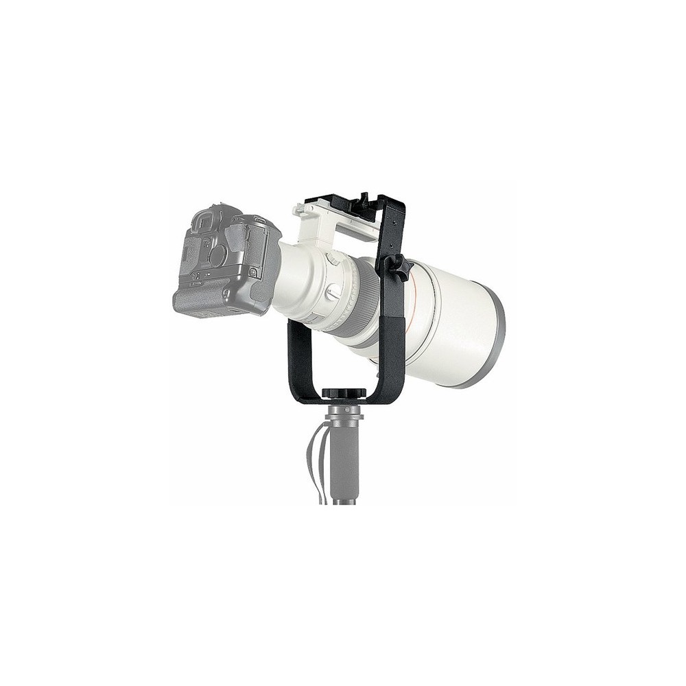 Specifically developed for use with very long lenses on Monopods. Key features: Friction base which enables the bracket to pan on Monopod, also can be used on a tripod. Two rubber hand grips plus rubber protection to prevent damage to lens when tilted to maximum. Variable center height adjustment in three steps.