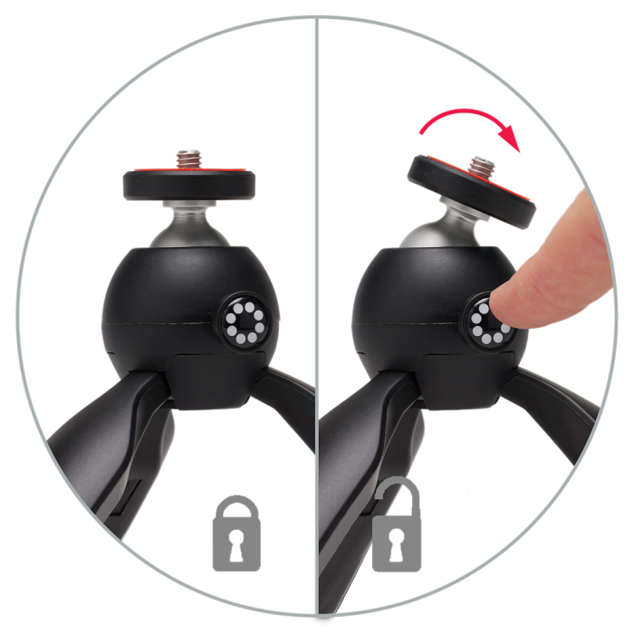The push-button mechanism enables to position and lock the ball head in one rapid, intuitive movement and to move it into portrait position.