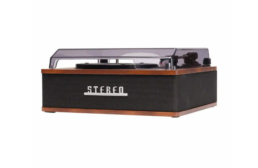 Featuring a ceramic stereo pickup with ruby stylus, protective dust cover, and auto‑stop for added care.