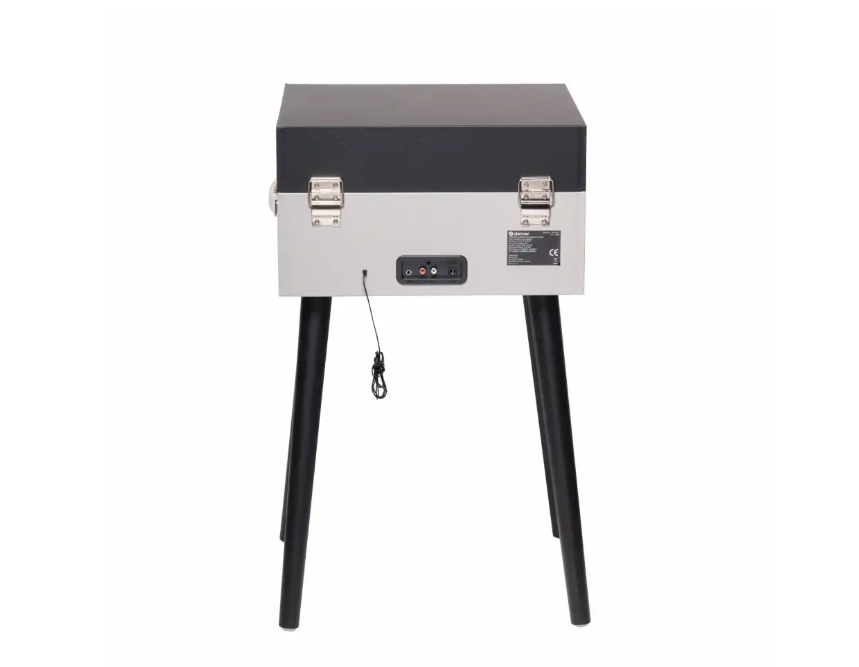 Retro charm meets portability with a stylish suitcase build and matching black legs.