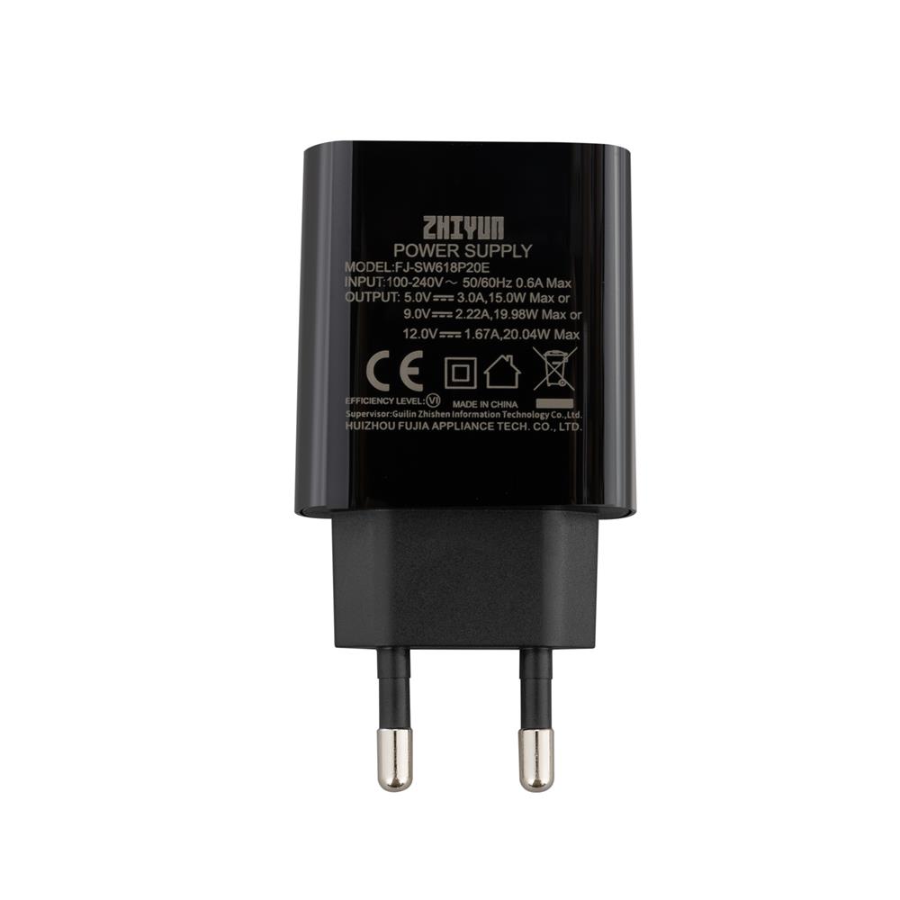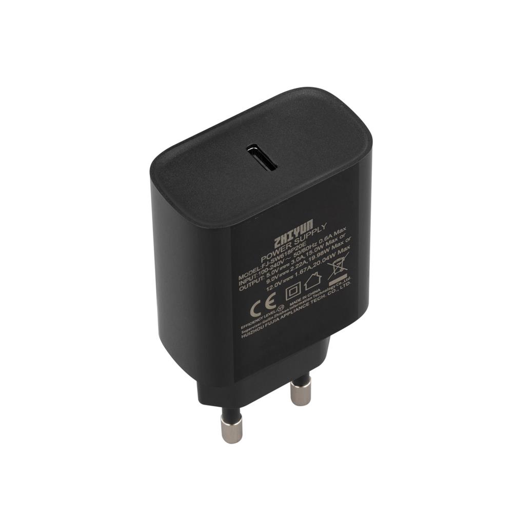 Fast charging charger with 20 W power, compatible with devices that have a USB Type-C charging port.