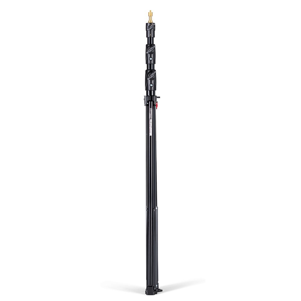 Aluminium stand with air cushioning. This stand has a minimum height of 118cm and a maximum height of 273cm. Although this stand weighs just 2kg, it can hold a safety payload of 10kg, and maintains a sturdy footprint of 106cm. The Ranker stand features 3 sections and 2 risers, and can be bough in a kit of 3 (1005BAC-3).