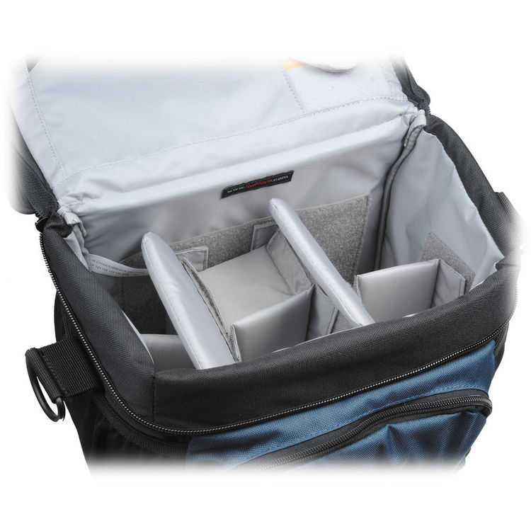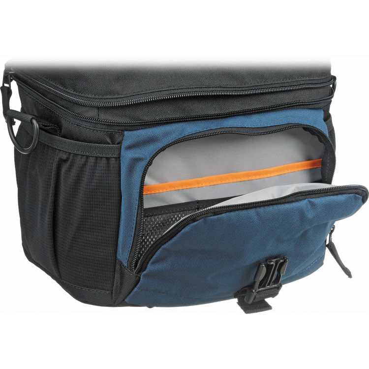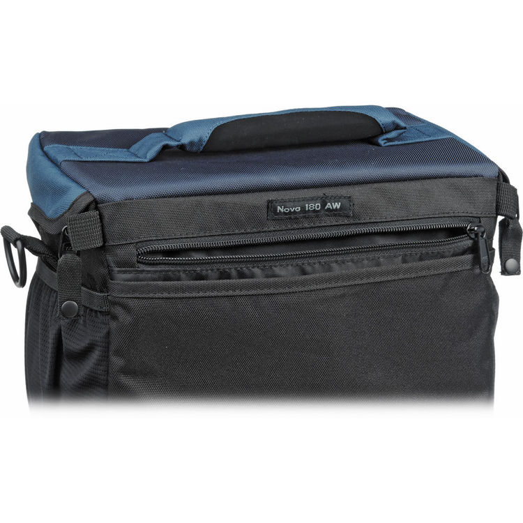 The Lowepro Nova 180 AW Shoulder Bag (Ultramarine Blue with Black Trim) is a rugged 840 denier nylon and 600 denier polyester bag with adjustable padded dividers and stitched hinges. It has an overflap lid to increase protection from the elements and a 360° All Weather Cover that offers maximum protection against rain, dust and sand while also providing full access to gear. There is an exterior front zippered pocket that provides easy access to cables, adapters and other digital accessories. Plus dual memory card pockets on the interior of the lid can keep memory cards in the same place every time. There are other interior and exterior pockets for accessories. The bag can be carried by a cushioned grab handle or removable, adjustable shoulder strap with non-slip pad.