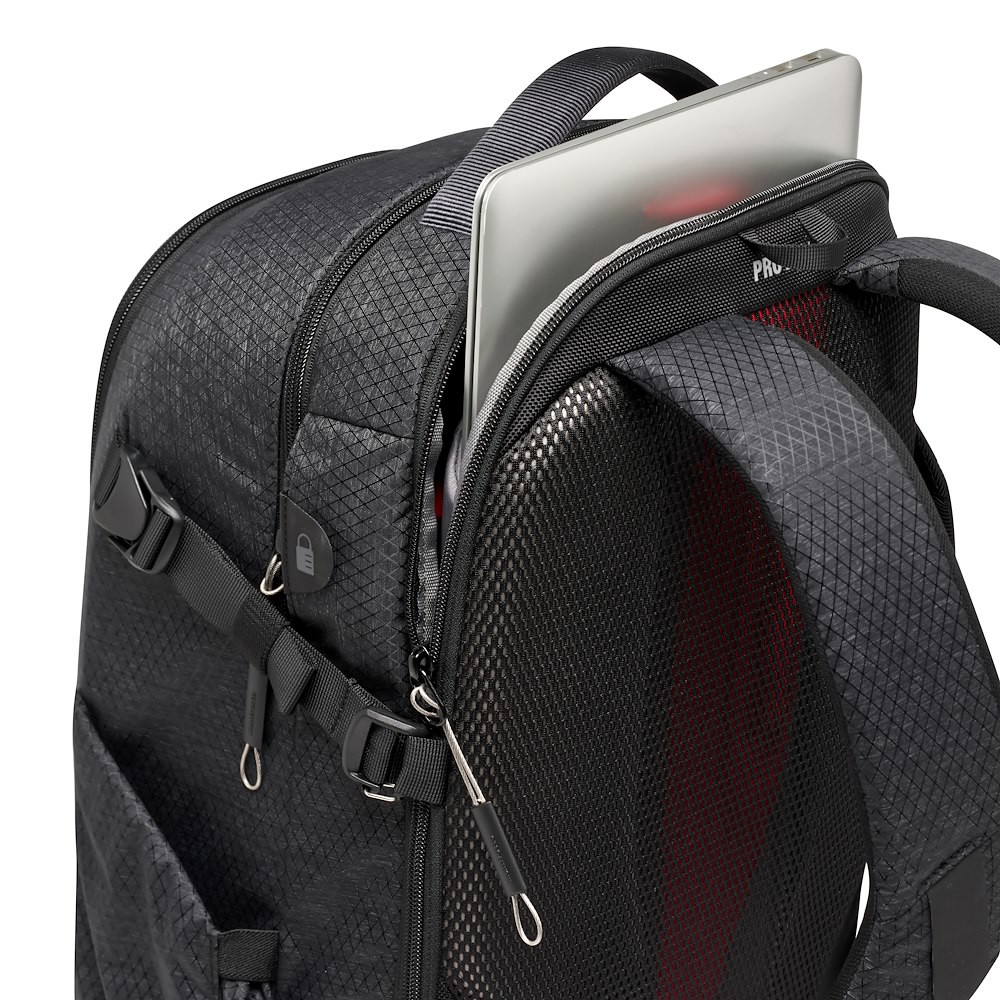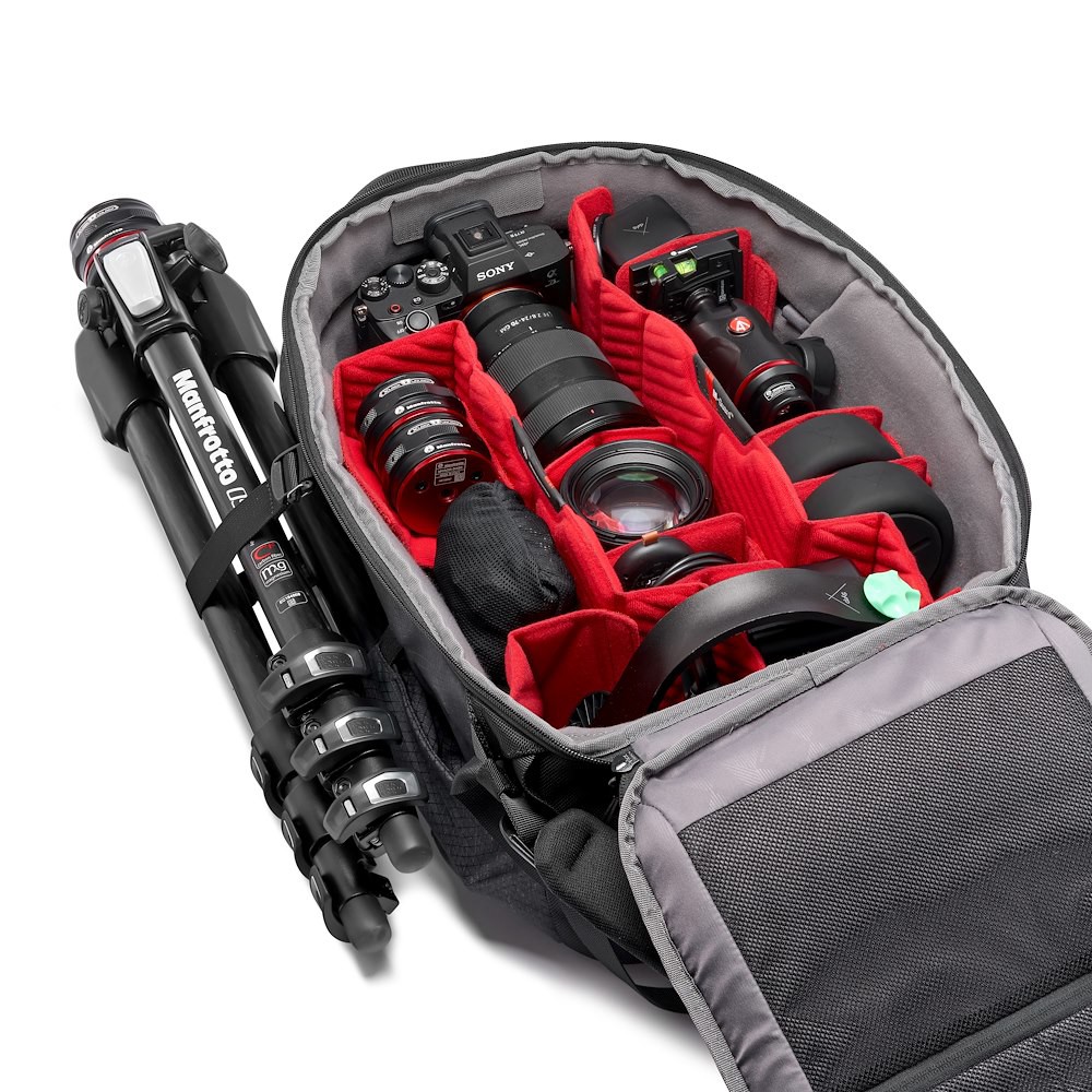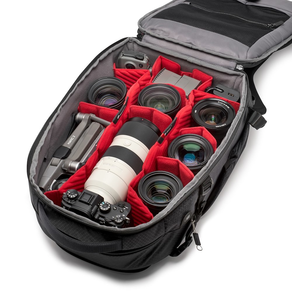 The Manfrotto PRO Light Backloader Camera Backpack M is a professional camera bag specifically designed to provide unparalleled gear protection to fit the preference and workflow of any professional photographer or filmmaker. The PRO Light backpacks usher in the all-new M-Guard™ Protection System specifically designed and laboratory tested to guarantee the highest level of protection and shock resistance especially on areas of the bag where protection is most crucial. M-Guard™ dividers are made of high-density EVA foam that provide exceptional shock absorption while maintaining a super slim profile. In addition the SAS-TEC, a viscoelastic memory foam and multi-impact endurance, adds a structural reinforcemnt on the base of the backpack providing extra shock absorbing properties. For an even better worry-free experience, a TSA approved padlock can be used to secure the steel wire puller to close the main compartment. The PRO Light Backloader comes with a safe rear access into a fully padded camera gear compartment with customizable interiors. For full shooting experience, the Backloader M holds 2-3 full frame DSLR or mirrorless cameras with portrait grip on the main compartment plus multiple lenses. Alternatevely the internal organization arrangement can be customized to meet different storage needs thanks to a moveable interior panel that can split the internal space in 2 additional different ways: the top compartment can be dedicated to the 20% to personal items and easily accessed by the quick top opening and the other 80% to gear or interchangeably carry 80% personal items and 20% camera gear. The top access point serves as an alternative for reaching into the most used cameras or lenses. In front is a multi-section compartment both internal end extrenal for small accessories and personal items along with a laptop section that holds a 15” laptop. The Backloader features a double-sided tripod connection for travel sized tripods, an adjustable chest strap for better carrying, and a DuoFace sun and rain cover that repels moisture and reflects sunlight to keep the gear cool and dry all day long. The backpack is made of water-repellant RipStop nylon/polyester fabric with reinforcement yarns to achieve a balance of light weight, unique look, and high capacity performance. Duraflex® hardware, YKK® zippers, hypalon reinforcement, trims and pullers make the pack both ultra-lightweight and strong enough to withstand the most intense use to ensure long-term protection for large amounts of gear.